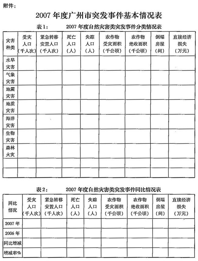 為做好突發事件的年度評估分析工作,根據廣東省《關于進一步加強應急管理工作意見》(粵府〔2007〕71號)和廣州市突發公共事件總體應急預案的有關要求,經市政府同意,由市應急辦組織開展2007年度突發事件應對工作評估分析,請各地、各有關單位按照職責分工,分別對自然災害、事故災難、公共衛生事件和社會安全事件四大類突發事件應對工作進行總結、分析和評估。現將有關事項通知如下: