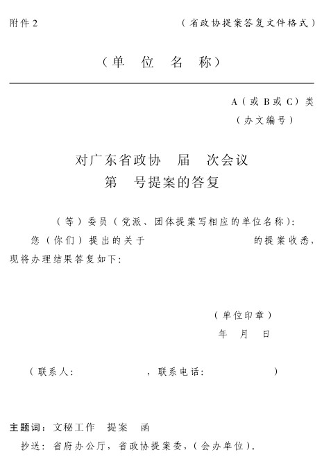 (五)市政協提案,由主辦單位綜合會辦單位意見后,將答復文件直接寄送提出提案的委員各1份(民主黨派、人民團體和政協專門委員會提案寄送3份),同時抄送市府辦公廳1份、市政協提案委員會3份、會辦單位各l份。