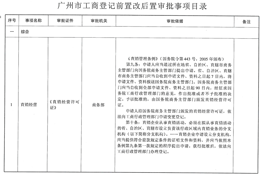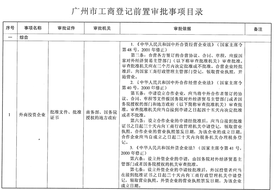 《廣州市工商登記前置審批事項目錄》和《廣州市工商登記前置改后置審批事項目錄》已經市人民政府同意,現(xiàn)印發(fā)給你們,請認真執(zhí)行。執(zhí)行中遇到問題,請徑向市商事登記制度改革工作聯(lián)席會議辦公室(設在市工商局)反映。