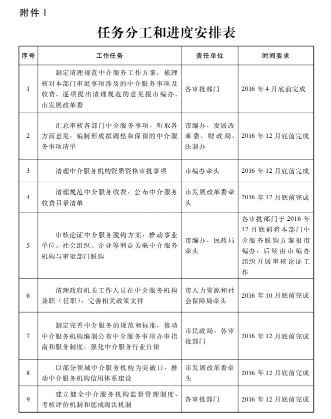 各審批部門要認真制定事業單位、社會組織、企業等利益關聯中介服務機構與審批部門的脫鉤方案,并于2016年12月30日前按任務分工要求報送市編辦。各有關責任單位要及時跟蹤各審批部門工作進展情況,加強統籌協調和督促檢查,確保清理規范中介服務工作取得實效。