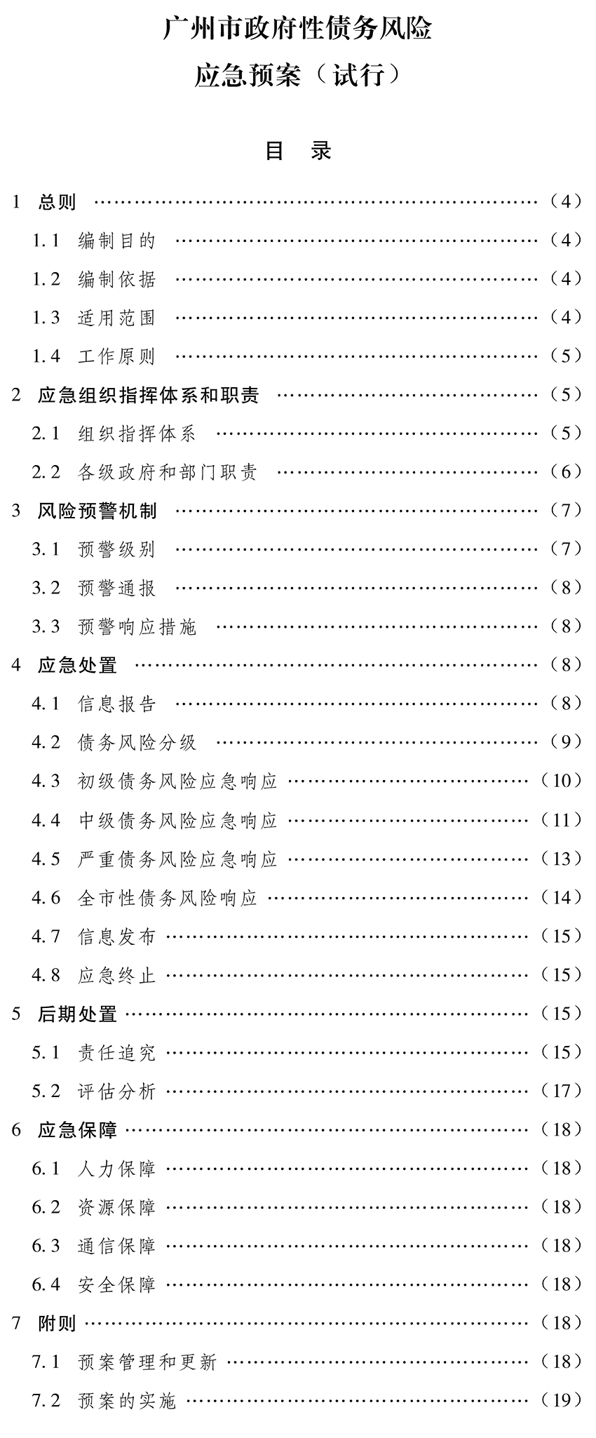 4.6.3 發生全市性嚴重債務風險的,由市政府成立債務風險處置領導小組,統籌協調有關部門和區政府,制定債務風險處置總體方案,并明確責任分工,建立督查機制,迅速將債務風險等級降至中級或以下。