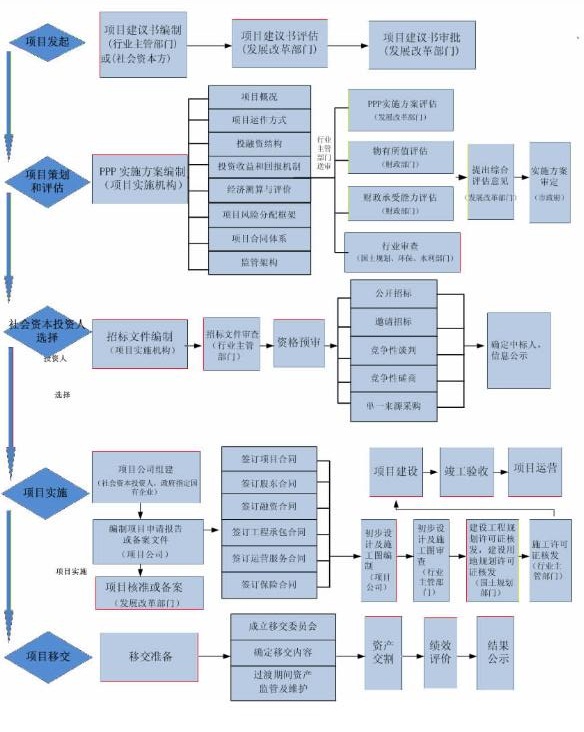 項目實施機構根據項目建議書、可行性研究報告審批文件編制PPP實施方案,經行業主管部門審查通過后,由行業主管部門報發展改革部門。PPP實施方案的主要內容為:項目概況、運作方式、建設運營和移交方案、投融資結構、投資收益和回報機制、社會資本合作伙伴遴選方式、物有所值分析、財政承受能力評價、經濟測算、風險分配框架、合同結構和主要內容、項目合作期限、爭議解決、項目監管和移交方式等。