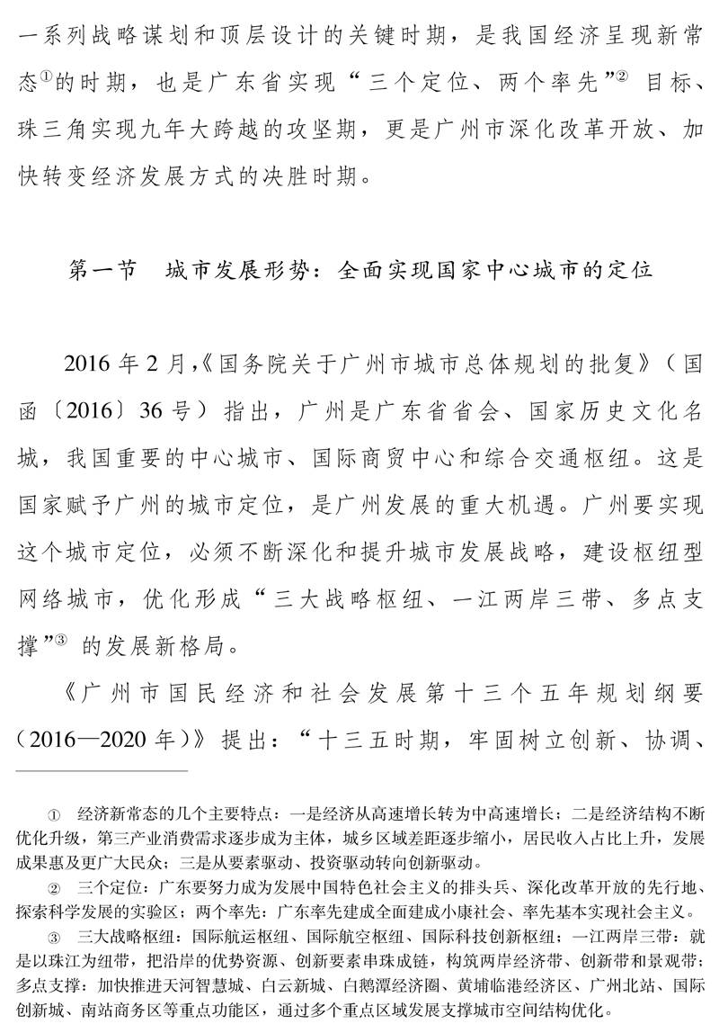 綠色、開放、共享的發展理念,落實省委、省政府部署要求,要緊密對接國家戰略,加快建設以白云國際空港、南沙海港、國鐵城際地鐵軌道交通陸港、高快速路網為核心的大交通體系,著力完善城市功能布局和重大生產力布局,加快形成新的動力源和增長極。”在此過程中,三大戰略樞紐相互呼應、互動發展,構成提升廣州國家中心城市的重要動力源和增長極,將廣州市建成廣東省宜居城鄉的“首善之區”和服務全國、面向世界的現代化國際大都市。