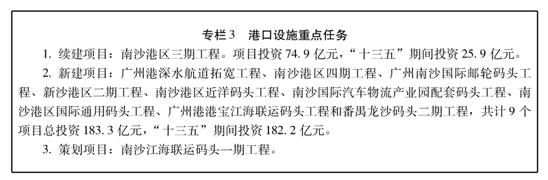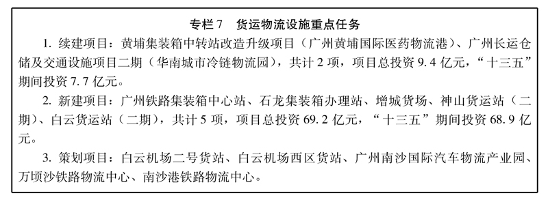 ——完善物流基礎設施建設。航空方面,推進順豐速運華南(廣州)航空快件轉運中心、穗佳華南空陸聯運集散樞紐、高端商品流通基地、聯邦快遞亞太轉運中心擴建等項目建設;港口方面,推進廣州港南沙港區四期工程、廣州南沙國際汽車物流產業園配套碼頭工程、廣州港南沙港區國際通用碼頭工程;鐵路方面,新建廣州鐵路集裝箱中心站、南沙集裝箱辦理站、石龍鐵路貨場以及增城鐵路貨場;公路方面,推進神山貨運站二期、白云貨運站二期等項目的建設。