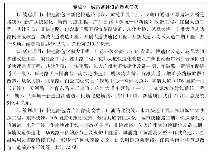 ——支撐重點地區發展。加強內部道路網絡建設,增強對外銜接和區域輻射能力。重點是加快臨江大道東延線(一期)、車陂路—新滘東路隧道、大學城—新造通道、花地大道改造工程、均禾大道二期工程、白云三線東段、從化大道、明珠灣大橋、新城大道改造工程等項目的建設和改造。