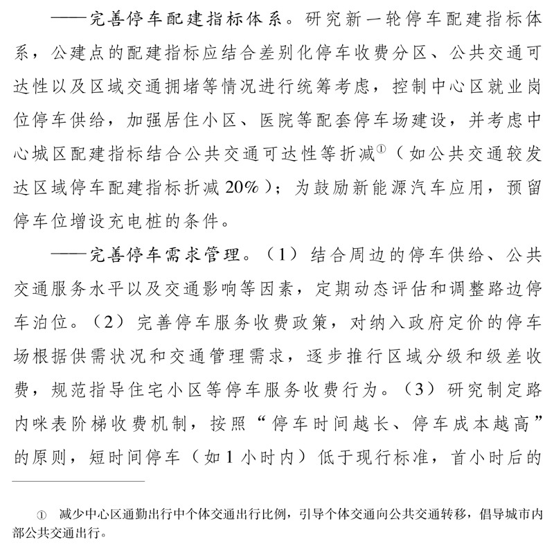 ——挖潛停車設施供給。(1)針對停車剛需較大且用地不足的地區,應結合城市升級改造、控規調整等,充分利用公共綠地、廣場等地下空間,統籌安排資金,科學安排建設,采取“先試點、后推廣”的模式,建設公共停車場。(2)挖潛和設置臨時停車設施,增加停車泊位供給。