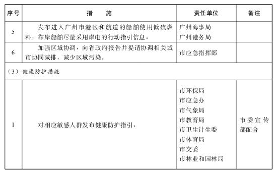 (17)廣州港務(wù)局:負(fù)責(zé)加強(qiáng)到港船舶岸電使用和港口堆場(chǎng)揚(yáng)塵污染控制,督促港口碼頭等人員密集場(chǎng)所做好環(huán)境空氣重污染預(yù)警信息的接收和傳播工作,在嚴(yán)重污染情況下開展港口船舶流量調(diào)控。