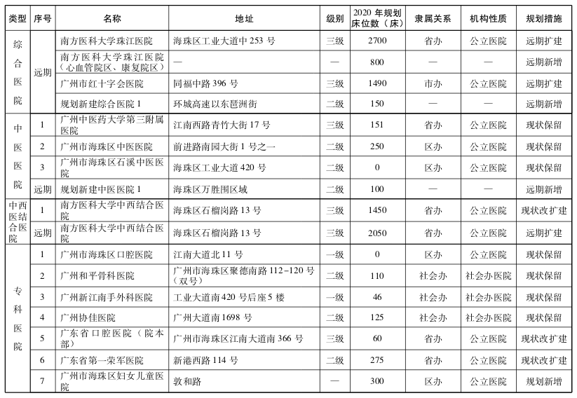2020年,廣州市共規劃綜合醫院169間,其中現狀保留87間,規劃新增22間,改擴建(含遷建)60間。