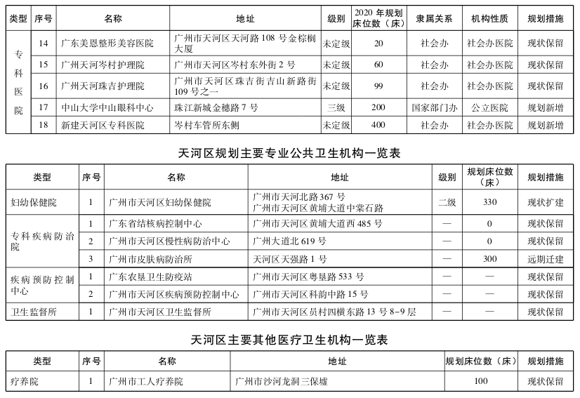 天河區為優化提升區,以整合現有醫療衛生資源、引進高水平社會辦醫療機構為策略。重點增加天河東部、北部醫療資源配置,規劃設置相應規模的公立醫療衛生機構,除現有建設項目外,嚴控天河區西南部公立醫院規模、床位不合理擴張;鼓勵優質社會資本提供婦女兒童、老年護理、口腔、中醫等專科服務;鼓勵區域內優質公立醫療資源向資源薄弱地區轉移,支持區內資源富余的二級以下公立綜合醫院,逐步轉型為護理院、康復醫院或者社區衛生服務機構,至少設置1家護理院、康復醫院或醫養結合機構。