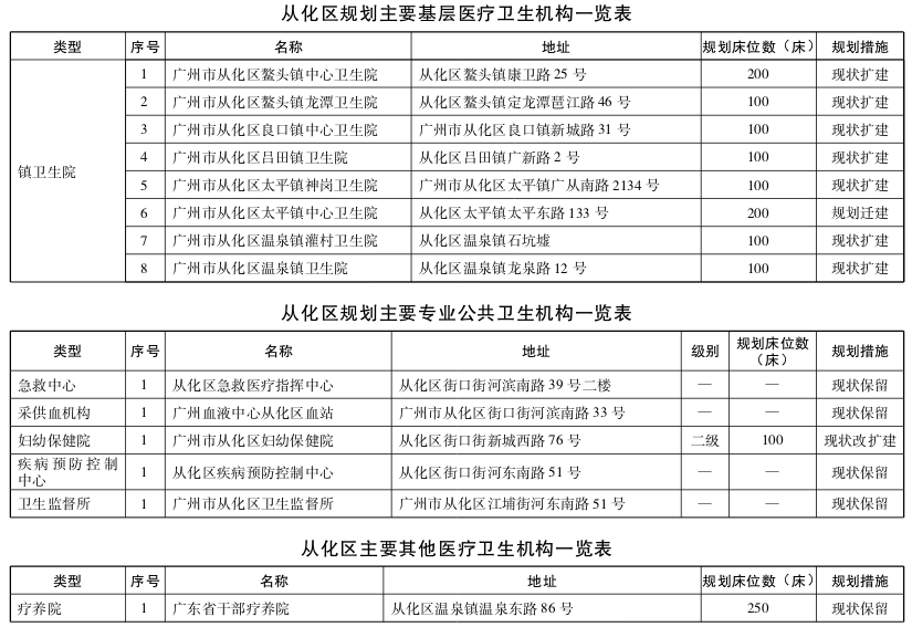 從化區為擴容提質區。加大對區域醫療資源的配置力度,增加綜合、婦女兒童、中醫、康復等公立醫療資源配置,在太平鎮等區域規劃設置相應規模的醫療衛生機構;鼓勵社會資本引進婦產、老年護理、精神衛生等醫療機構;增加鎮衛生院床位配置;至少設置1家護理院、康復醫院或醫養結合機構。允許從化區在現有規劃基礎上,規劃新增1家以上綜合或專科醫院。