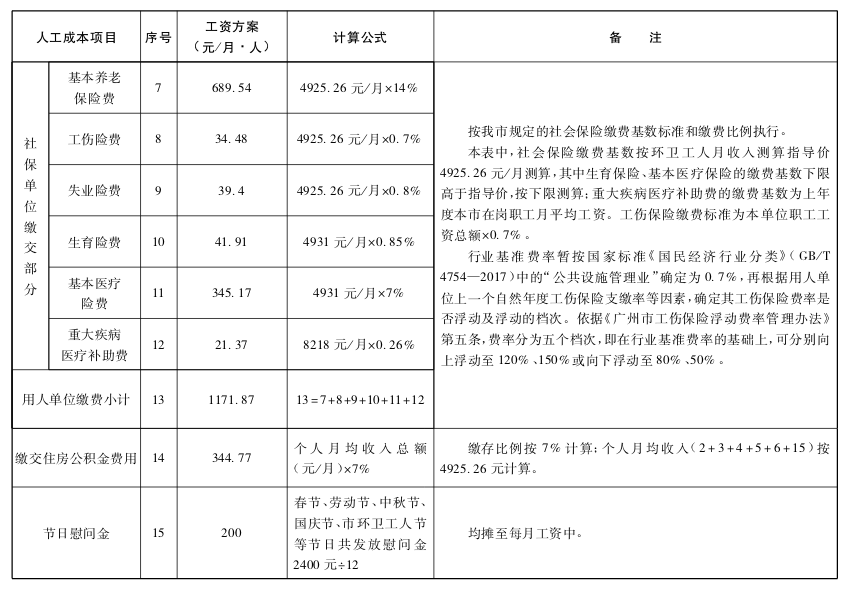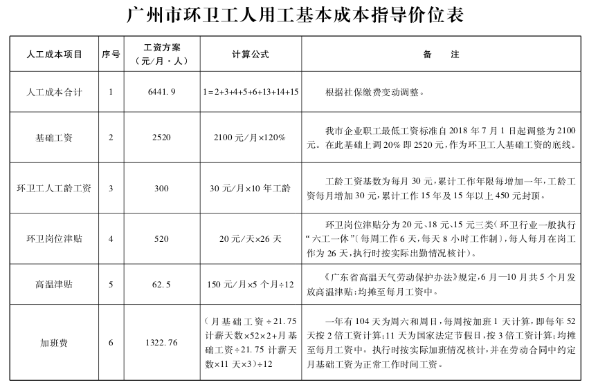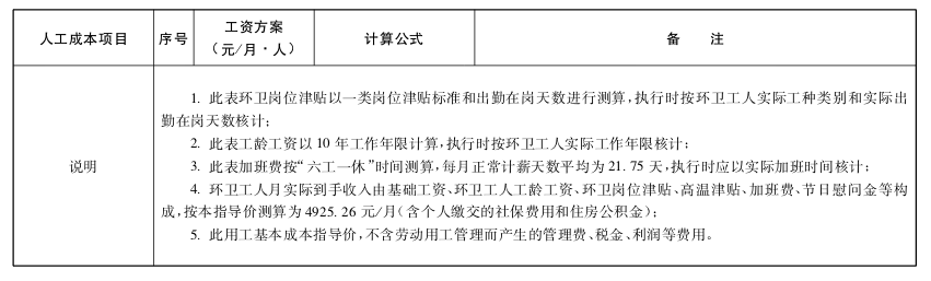 (二)環衛用工成本指導價包括基礎工資、環衛崗位津貼、環衛工人工齡工資、高溫津貼、加班或者延長工作時間工資、國家法定節日和市環衛工人節慰問金、社會保險(單位繳納部分)、住房公積金(單位繳納部分)8個部分,其他項目按照現有的法律、法規執行。