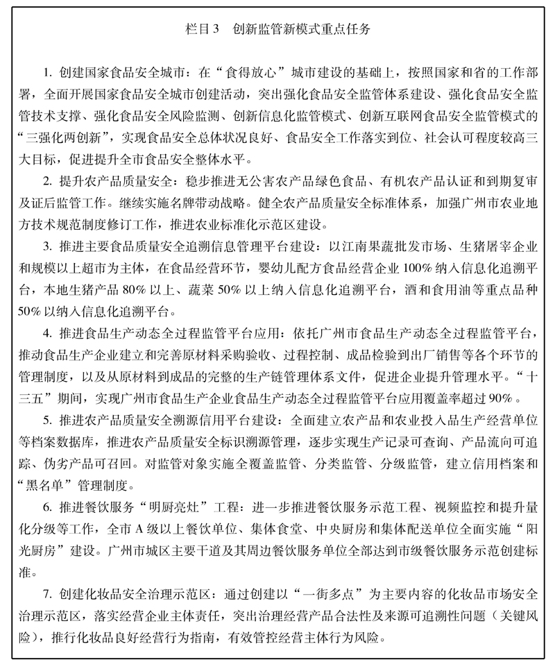 到“十三五”期末,廣州市建立完善統一高效的食品藥品安全監管體系和技術支撐體系,實施食品藥品安全科學精細監管、集中高效監管和社會協同共治,實現食品藥品安全治理能力顯著提高、安全形勢持續穩定向好、市民群眾安全滿意度明顯提升、食品藥品產業健康有序發展,將廣州建設成為全國食品藥品安全城市。
