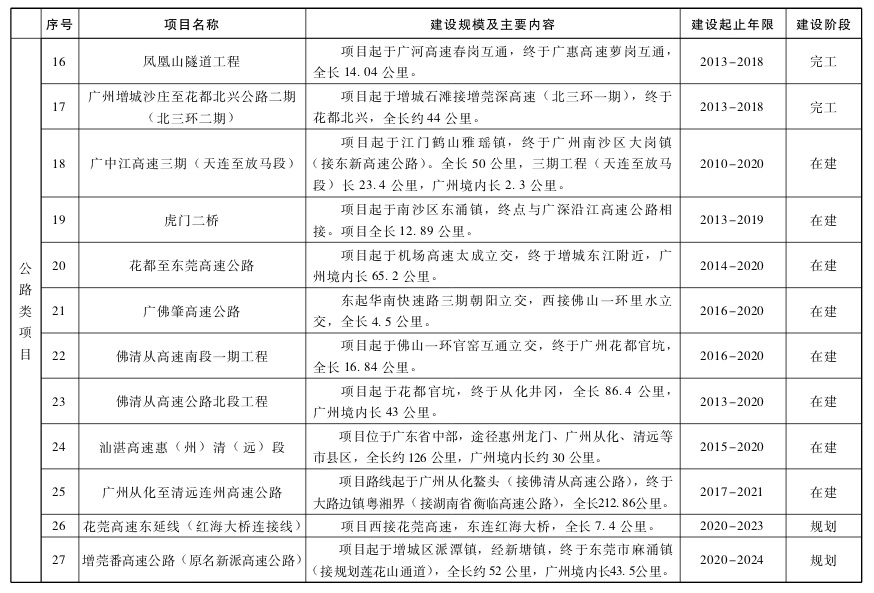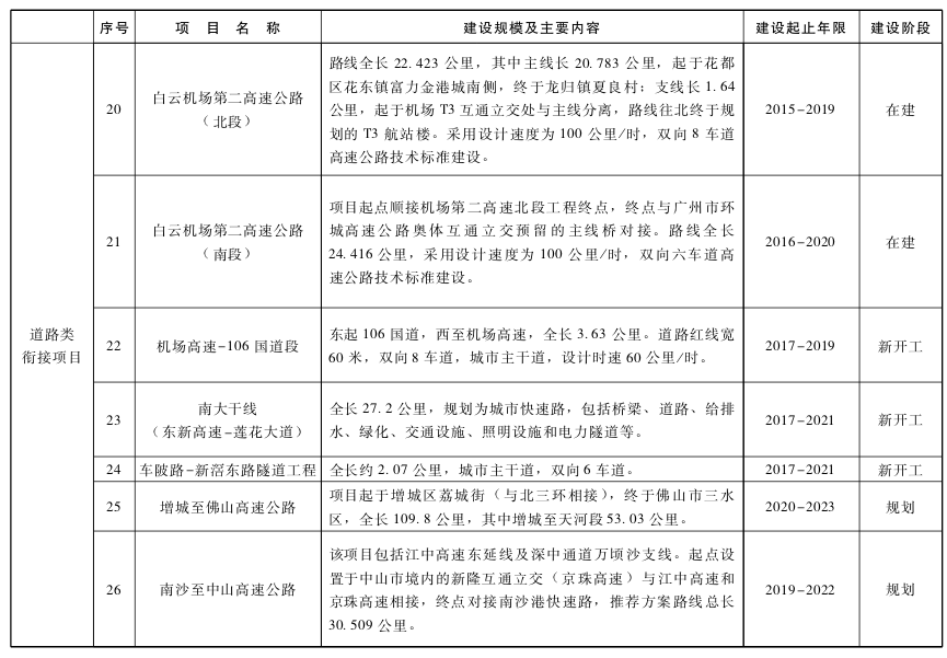佛山方面,加快建設(shè)珠江大橋放射線接廣佛新干線、欖核鎮(zhèn)西向公路延長(zhǎng)線、廣佛肇高速,加快推進(jìn)五丫口大橋大中修工程,規(guī)劃建設(shè)增佛高速、建設(shè)大道接大坦沙大橋工程、沉香沙大橋,盡快啟動(dòng)S118黃村至大渦段拓寬改造工程等項(xiàng)目。惠州方面,繼續(xù)推進(jìn)從莞高速惠州段和汕湛高速惠州至清遠(yuǎn)段,規(guī)劃研究花莞高速東延線等項(xiàng)目。東莞方面,加快建設(shè)虎門二橋,深化研究增莞番高速與東莞路網(wǎng)銜接工作,規(guī)劃建設(shè)蓮花山過江隧道、新槎大橋等項(xiàng)目。中山方面,繼續(xù)加快建設(shè)廣中江高速,規(guī)劃研究南沙至中山高速及S111南沙段改造工程等項(xiàng)目。清遠(yuǎn)方面,配合推進(jìn)佛清從高速北段、東環(huán)快速路南延至樂廣高速王子山出入口、廣連高速花都至連州段等項(xiàng)目。