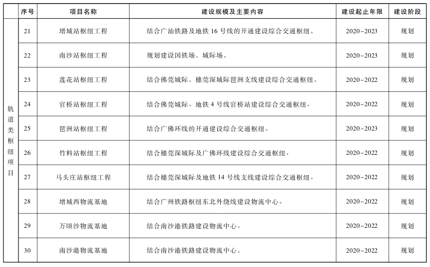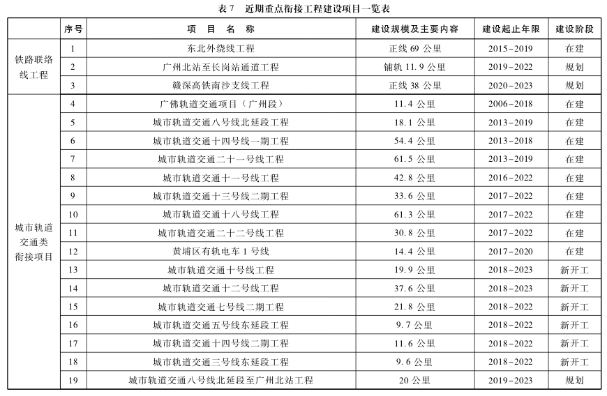 推動(dòng)廣佛同城化發(fā)展,加快建設(shè)廣佛環(huán)城際、佛莞城際、廣佛地鐵瀝滘至燕崗段、廣州地鐵7號(hào)線西延順德段、佛山地鐵2號(hào)線,規(guī)劃建設(shè)廣湛高鐵、廣佛江珠城際等,規(guī)劃研究佛山地鐵8號(hào)線銜接白云站方案。完善與東莞、深圳及香港等大灣區(qū)東岸城市的交通銜接,加快建設(shè)佛莞城際、穗莞深城際,規(guī)劃建設(shè)深茂鐵路深圳至江門段、贛深高鐵南沙支線,規(guī)劃研究東北客車聯(lián)絡(luò)線、廣州地鐵22號(hào)線延伸至東莞、廣州地鐵5號(hào)線與東莞地鐵1號(hào)線對(duì)接、廣州地鐵28號(hào)線支線等。強(qiáng)化與中山、珠海及澳門等大灣區(qū)西岸城市的交通聯(lián)系,建設(shè)南沙港鐵路,規(guī)劃建設(shè)廣中珠澳高鐵,廣州地鐵18號(hào)線延伸至中山等。推動(dòng)廣清一體化,加快建設(shè)廣清城際,規(guī)劃建設(shè)廣清城際廣州站至廣州北段,規(guī)劃研究廣清永高鐵方案。加強(qiáng)與惠州、河源等粵東城市的銜接,加快建設(shè)廣汕鐵路,規(guī)劃建設(shè)廣河高鐵。