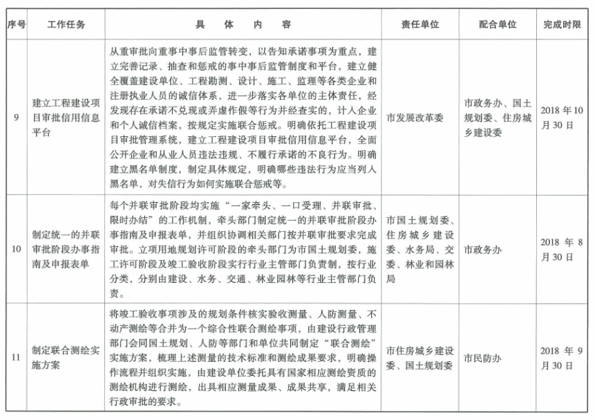 11.合并辦理質量安全監督登記與施工許可。全面推進信息化管理,將質量安全監督登記手續整合納入施工許可辦理事項中,一次申報,同步審核。(牽頭單位:市住房城鄉建設委)