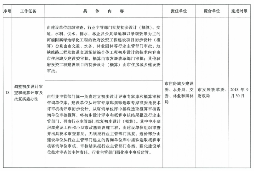 8.明晰責權、確保工程方案與造價標準相匹配。由建設單位組織審查,行業主管部門批復初步設計(概算)。交通、水利、供水、排水,林業及公共綠地和以景觀效果為主的河涌附屬綠地綠化工程的政府投資工程建設項目初步設計(概算)分別由交通、水務、林業園林等行業主管部門審批;地鐵線路工程及軌道交通場站綜合體工程初步設計的技術內容由市住房城鄉建設委審批,概算由市發展改革委審批;其他政府投資工程建設項目的初步設計(概算)由市住房城鄉建設委審批。