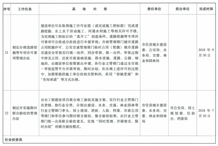 18.提前辦理道路挖掘等專項許可事項。建設單位可在取得施工許可證前(或完成施工招標前)完成道路挖掘、水上水下活動施工、河涌水利施工等相關許可手續,為實現施工招標后的“真開工”創造條件。道路挖掘等專項許可事項可分段或分階段進行申報審批;市政管理部門城市道路占用挖掘許可、公安交通管理部門臨時占用(挖掘)城市道路交通安全審核實行“統一收件,同步審核,統一出件”。審批過程中涉及占用、遷改市政基礎設施、排水設施、道路、公路、綠地的,由建設單位按需提出申請,各行業主管部門通過全市統一審批監管平臺并聯審批,限時辦結。在辦理上述許可的過程中,如需要提供施工單位的相關資料的,采用“容缺受理”和“告知承諾”等方式辦理。(牽頭單位:市住房城鄉建設委、公安局、水務局、交委、林業和園林局)