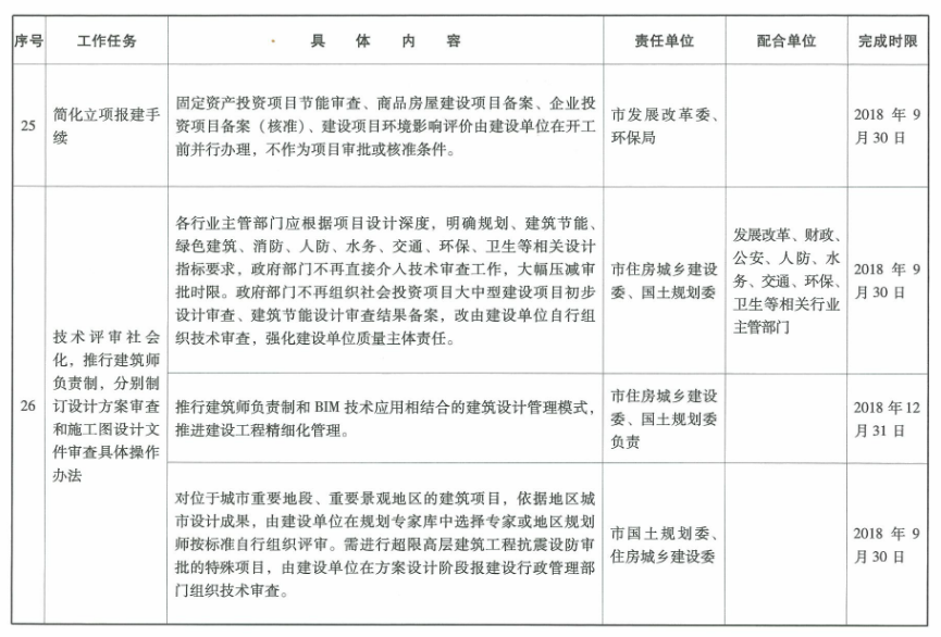 4.技術評審社會化,推行建筑師負責制。各行業主管部門應根據項目設計深度,明確規劃、建筑節能、綠色建筑、消防、人防、水務、交通、環保、衛生等相關設計指標要求,政府部門不再直接介入技術審查工作,大幅壓減審批時限。政府部門不再組織社會投資項目大中型建設項目初步設計審查、建筑節能設計審查結果備案,改由建設單位自行組織技術審查,強化建設單位質量主體責任。(牽頭單位:市住房城鄉建設委、國土規劃委,配合單位:發展改革、財政、公安、人防、水務、交通、環保、衛生等相關行業主管部門)