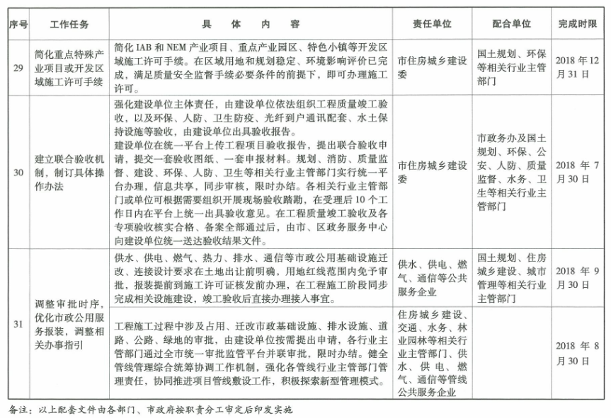 10.簡化IAB(新一代信息技術、人工智能、生物醫藥)和NEM(新能源、新材料)產業項目、重點產業園區、特色小鎮等開發區域施工許可手續。在區域用地和規劃穩定、環境影響評價已完成,滿足質量安全監督必要條件的前提下,即可辦理施工許可。(牽頭單位:市住房城鄉建設委,配合單位:國土規劃、環保等相關行業主管部門)