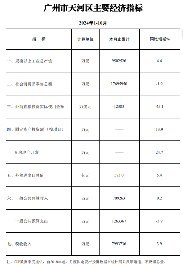 2024年1-10月廣州市天河區(qū)主要經(jīng)濟指標