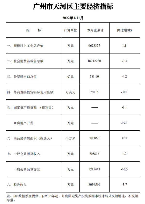 2022年1-11月廣州市天河區(qū)主要經(jīng)濟(jì)指標(biāo)