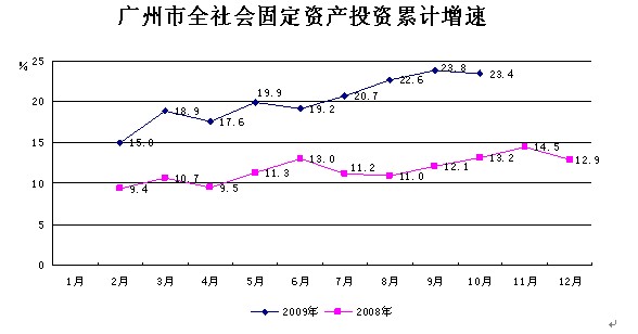 全社會(huì)固定資產(chǎn)投資快速增長(zhǎng)。在新廣州站及相關(guān)工程、亞運(yùn)村及亞運(yùn)場(chǎng)館、地鐵工程等重點(diǎn)項(xiàng)目的帶動(dòng)下,全社會(huì)固定資產(chǎn)投資保持快速增長(zhǎng)。1―10月累計(jì),全市完成全社會(huì)固定資產(chǎn)投資1789.19億元,同比增長(zhǎng)23.4%,增幅比上半年提高4.2個(gè)百分點(diǎn)。其中,基本建設(shè)和更新改造投資增勢(shì)強(qiáng)勁,分別完成投資924.55億元和274.84億元,分別增長(zhǎng)33.2%和59.8%;房地產(chǎn)開(kāi)發(fā)投資轉(zhuǎn)降為升,完成投資582.01億元,增長(zhǎng)0.6%。