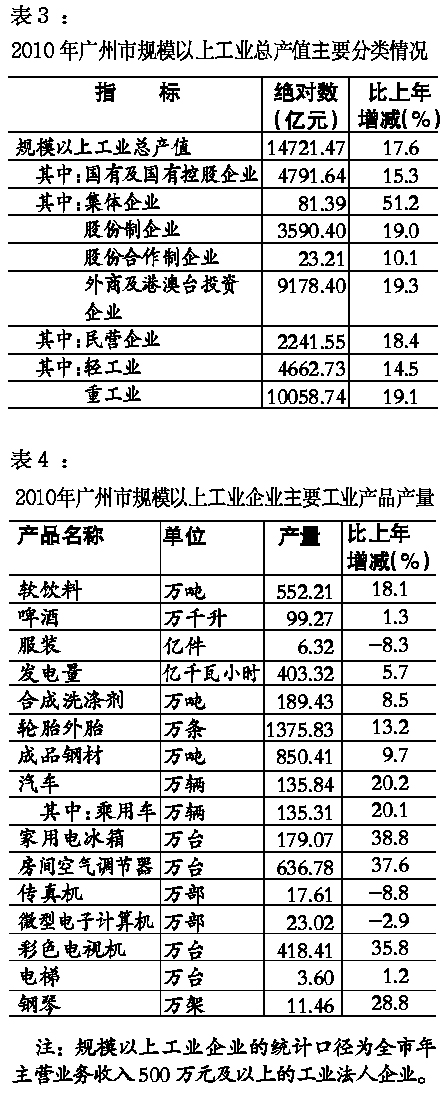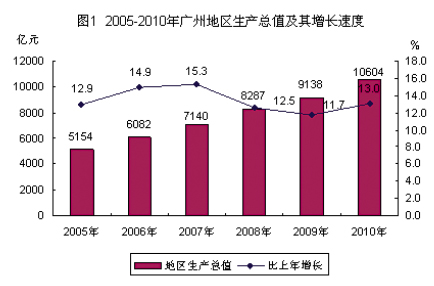 全市經濟保持較快發展。2010年,廣州市實現地區生產總值(GDP)10604.48億元,按可比價格計算,比上年(下同)增長13.0%。其中,第一產業增加值189.05億元,增長3.2%;第二產業增加值3950.64億元,增長13.0%;第三產業增加值6464.79億元,增長13.2%。第一、二、三次產業增加值的比例為1.8∶37.2∶61.0。三次產業對經濟增長的貢獻率分別為0.4%、38.4%和61.2%。