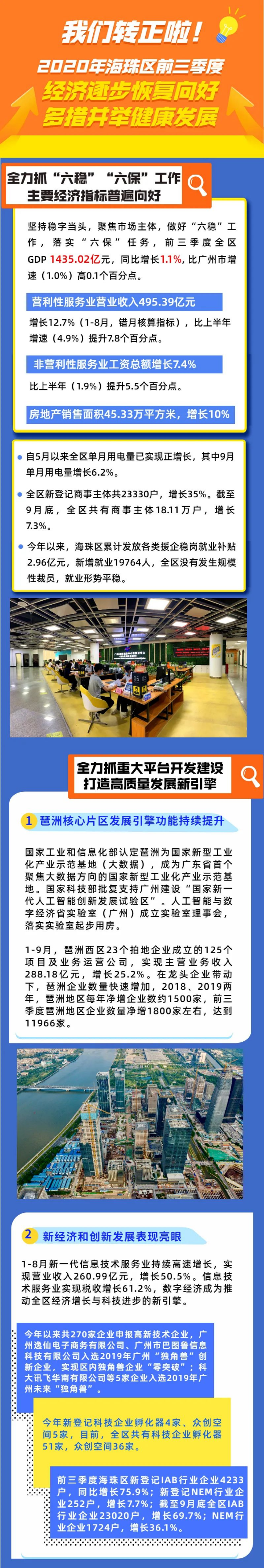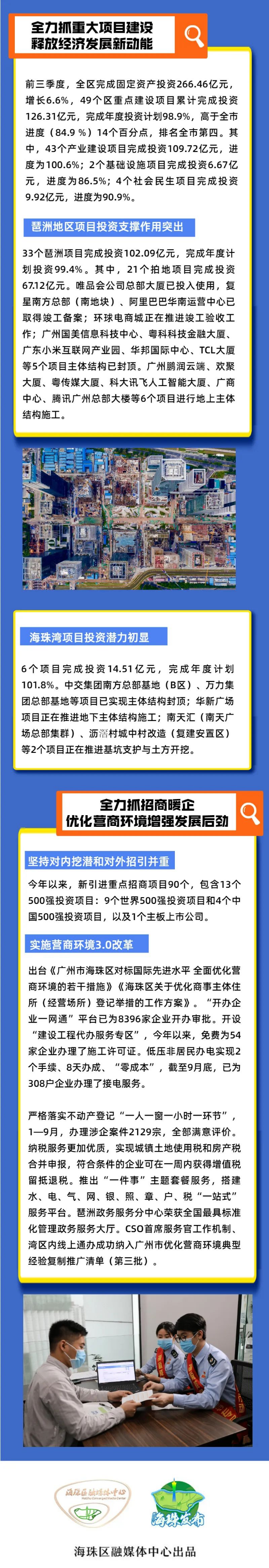 今年以來,面對錯綜復雜的內外部環境,海珠區統籌推進常態化疫情防控和經濟社會發展工作,全區各部門、各街道緊密協作、多措并舉、攻堅克難,扎實做好“六穩”工作,全面落實“六?!比蝿?,全力穩住經濟基本盤。前三季度GDP增速由負轉正,全區經濟呈逐步恢復向好態勢。