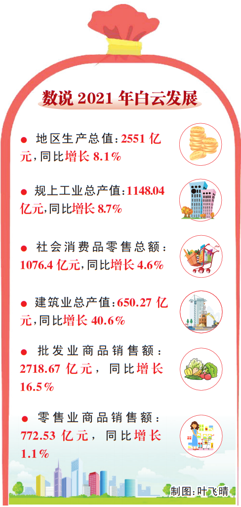 2021年,白云區積極應對國內外疫情反復、國際大宗商品價格上漲、缺芯缺電等不利因素,經濟持續穩定發展。數據顯示,2021年,白云區地區生產總值為2551億元,同比增長8.1%,主要發展預期目標順利完成,實現“十四五”良好開局。