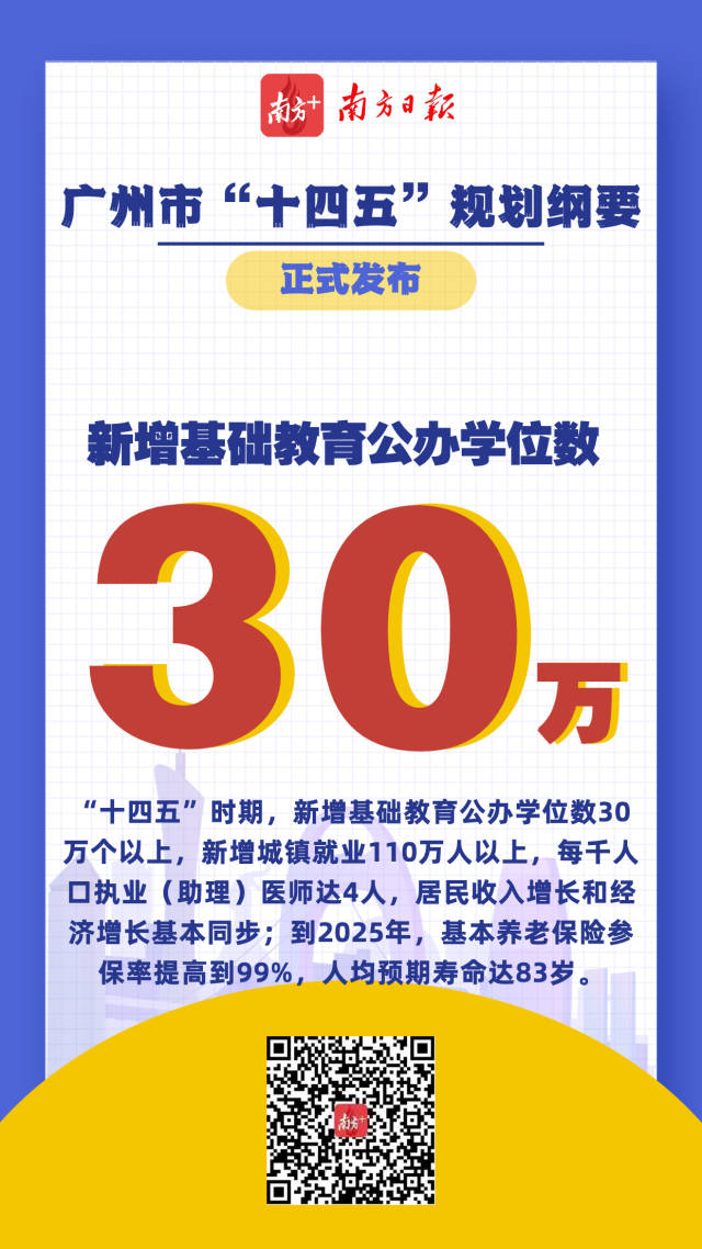 “十四五”時期,新增基礎(chǔ)教育公辦學(xué)位數(shù)30萬個以上,新增城鎮(zhèn)就業(yè)110萬人以上,每千人口執(zhí)業(yè)(助理)醫(yī)師達4人,居民收入增長和經(jīng)濟增長基本同步;到2025年,基本養(yǎng)老保險參保率提高到99%,人均預(yù)期壽命達83歲。