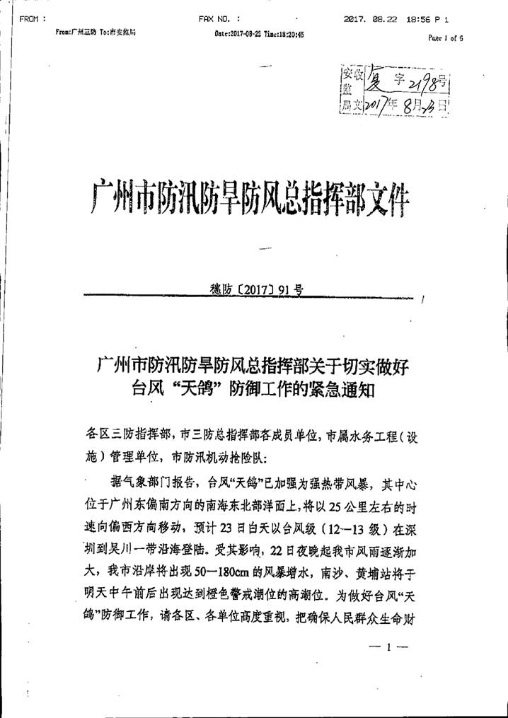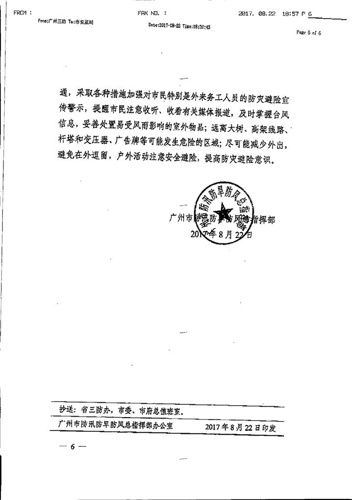 轉發廣州市防汛防旱防風總指揮部關于切實做好臺風“天鴿”防御工作的緊急通知