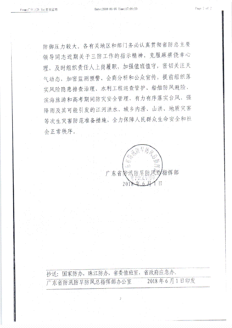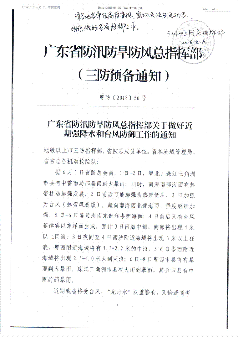 轉發廣東省防汛防旱防風總指揮部關于做好近期強降水和臺風防御工作的通知,請各單位做好防御