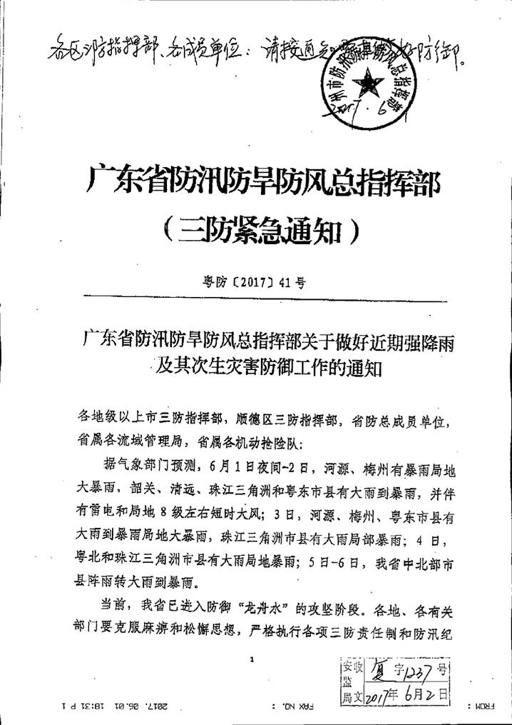 轉發廣東省防汛防旱防風總指揮部關于做好近期強降雨及其次生災害防御工作的通知