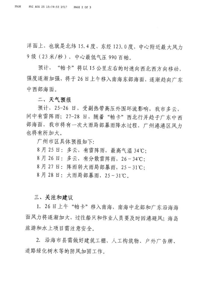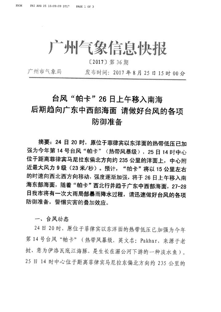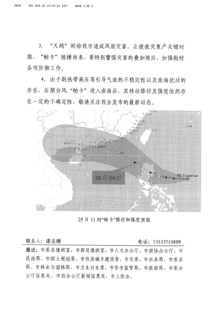 轉(zhuǎn)發(fā)臺(tái)風(fēng)“帕卡”26日上午移入南海,后期趨向廣東中西部海面,請(qǐng)各單位做好臺(tái)風(fēng)的各項(xiàng)防御準(zhǔn)備