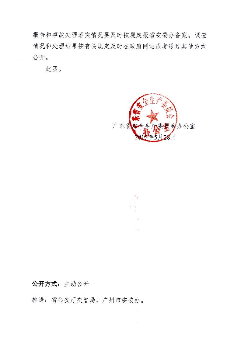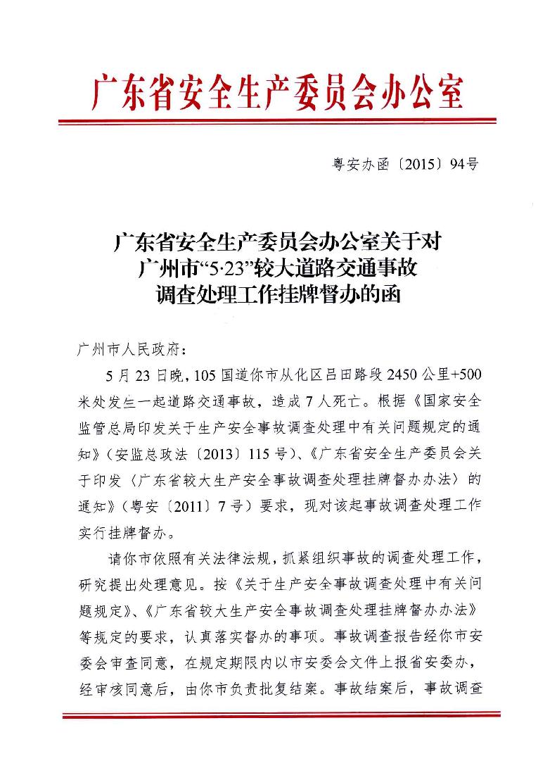 廣東省安全生產委員會辦公室關于對廣州市“5.23”較大道路交通事故調查處理工作掛牌督辦的函