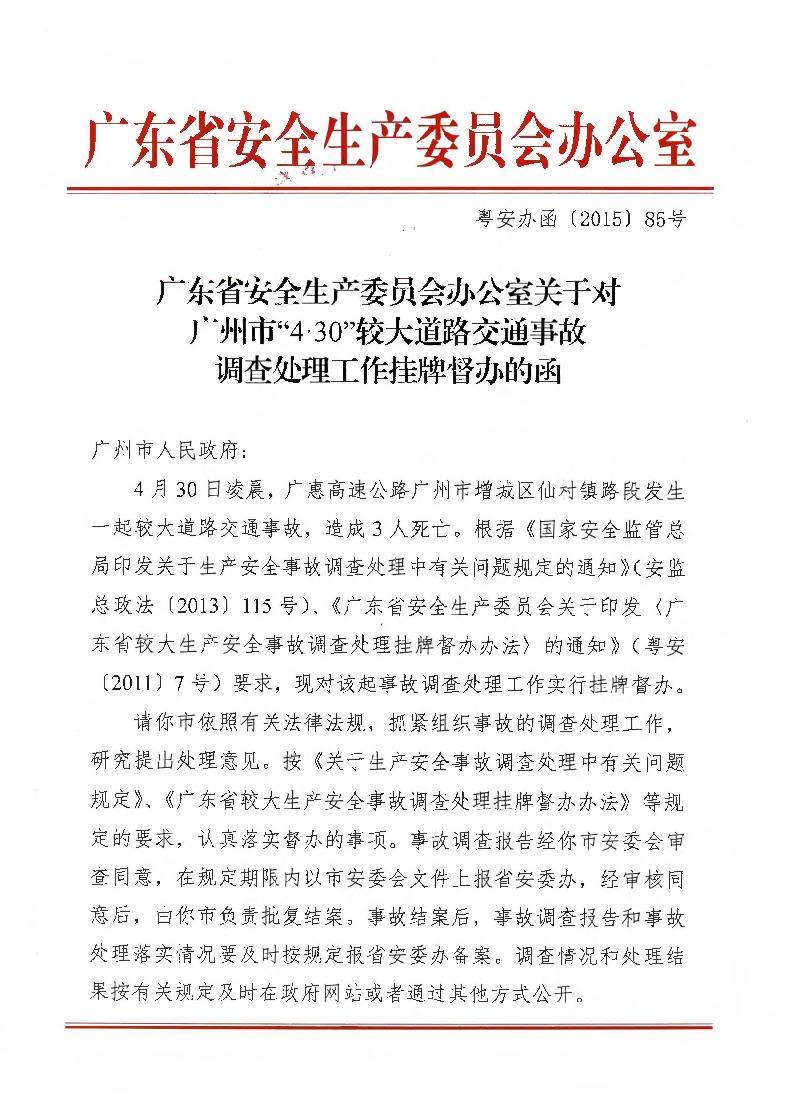 廣東省安全生產委員會辦公室關于對廣州市“4.30”較大道路交通事故調查處理工作掛牌督辦的函