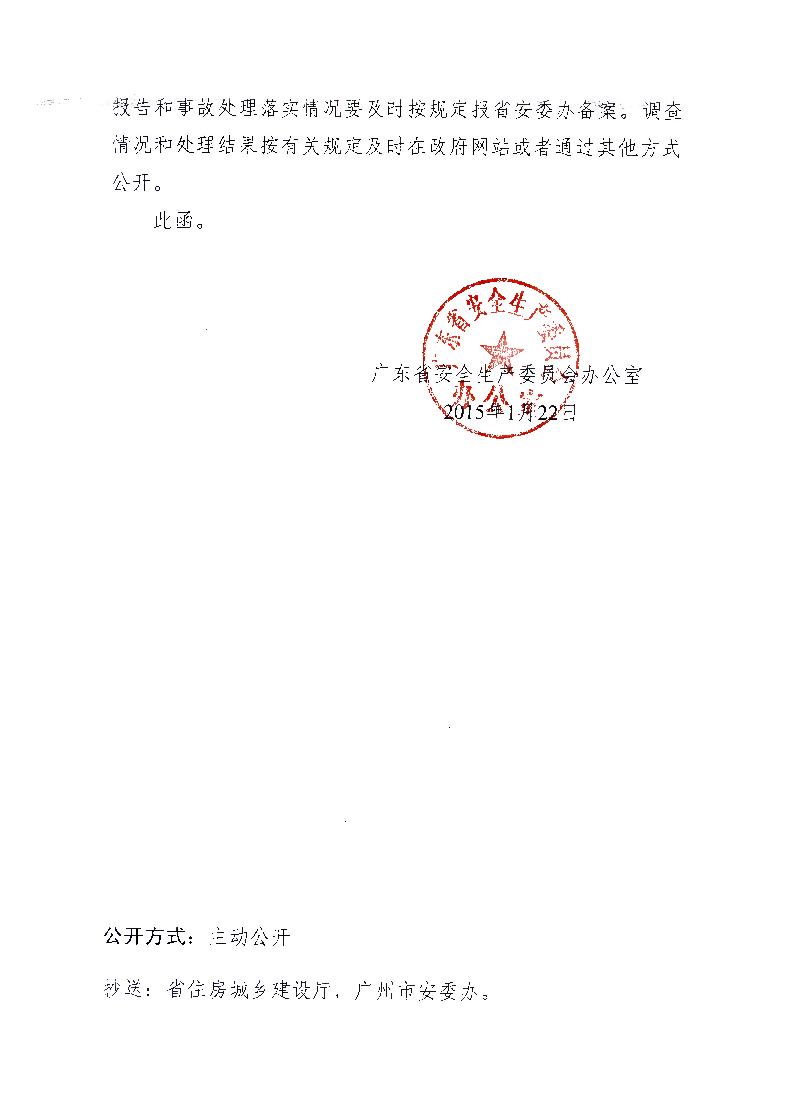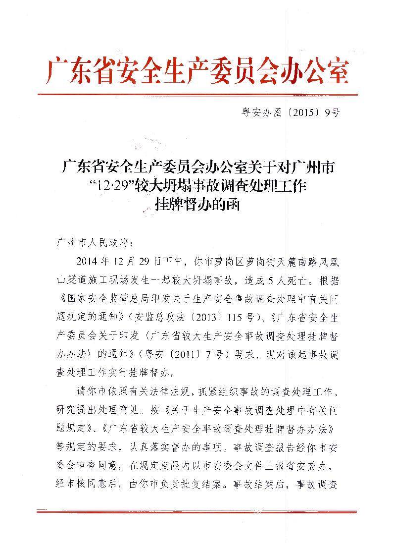 廣東省安全生產(chǎn)委員會(huì)辦公室關(guān)于對(duì)廣州市“12.29”較大坍塌事故調(diào)查處理工作掛牌督辦的函