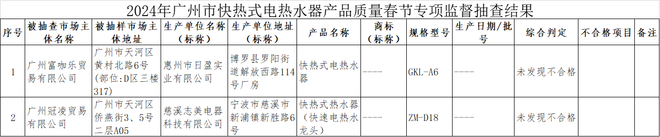 附件:2024年廣州市快熱式電熱水器產(chǎn)品質(zhì)量春節(jié)專項監(jiān)督抽查結(jié)果
