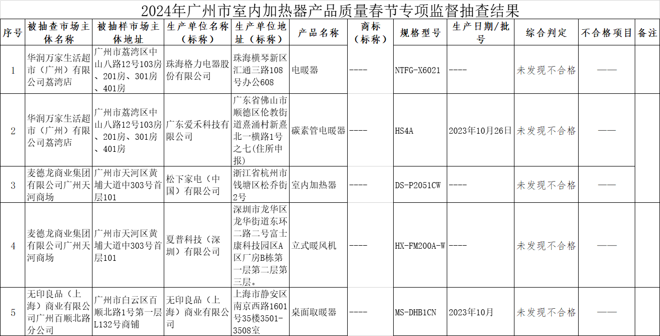 附件:2024年廣州市室內加熱器產品質量春節專項監督抽查結果