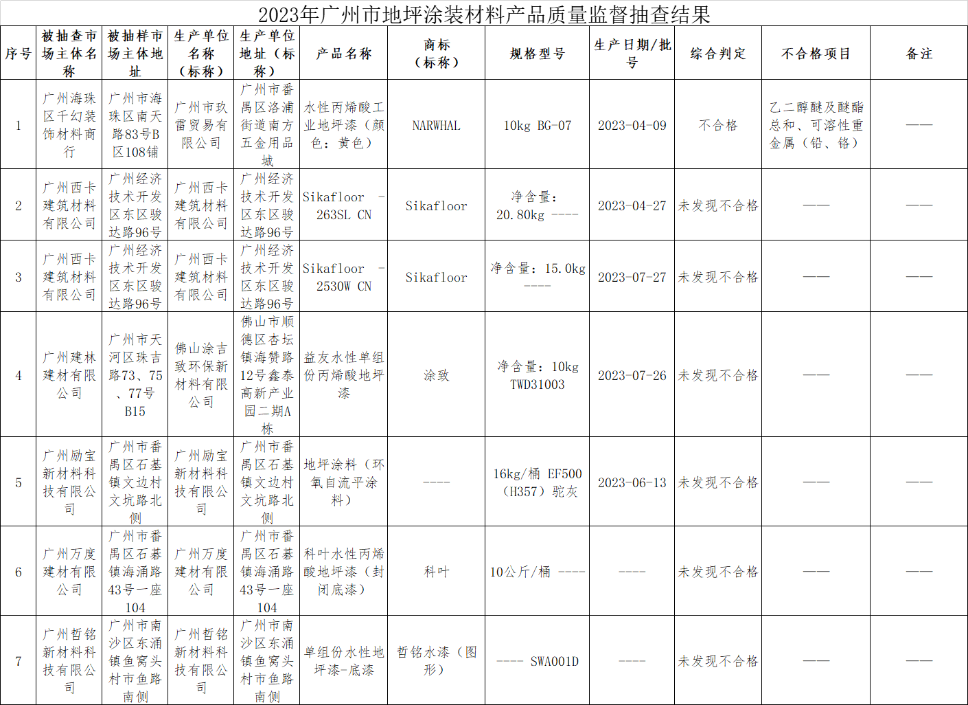2023年第3季度,廣州市市場監督管理局對地坪涂裝材料產品質量進行了監督抽查,共抽查了7批次樣品,經檢驗,有1批次產品不符合標準要求。