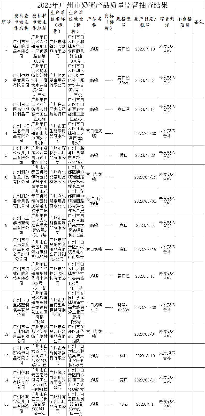 2023年第三季度,廣州市市場監督管理局對奶嘴產品質量進行了監督抽查,共抽查了15批次樣品,經檢驗,全部產品均符合標準要求。