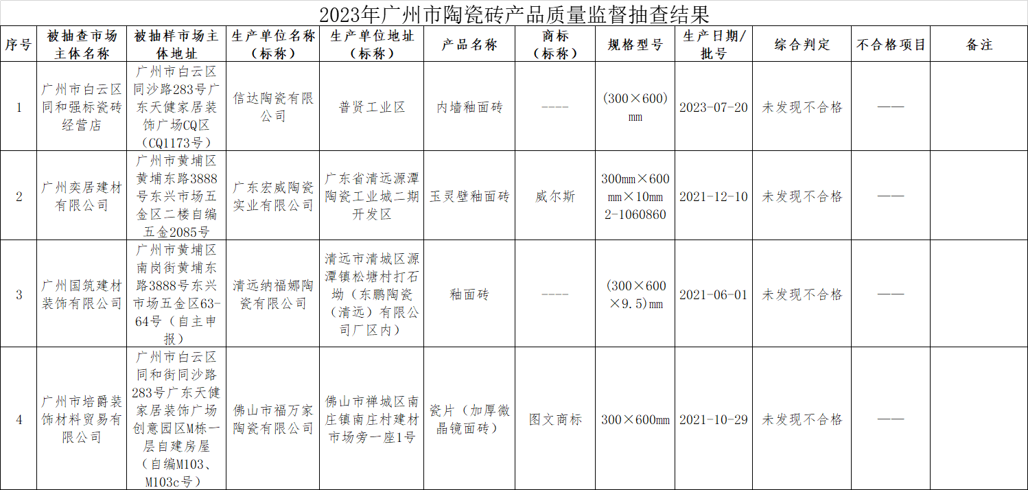 2023年第三季度,廣州市市場監督管理局對瓷質磚產品質量進行了監督抽查,共抽查了4批次樣品,經檢驗,全部產品符合標準要求。