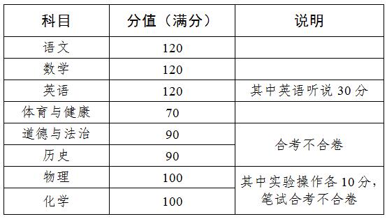 錄取計分科目采用“4+4”模式,即語文、數(shù)學(xué)、英語、體育與健康,道德與法治、歷史、物理、化學(xué),滿分為810分。具體見下表: