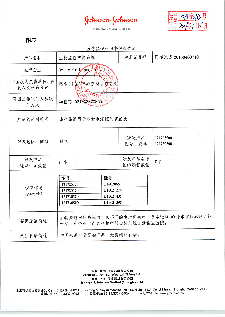 強生(上海)醫(yī)療器材有限公司報告,該公司代理的生物型髖臼杯系統(tǒng)(注冊證編號:國械注進20153460710),發(fā)現(xiàn)日本進口10件未在日本注冊的一家生產(chǎn)企業(yè)生產(chǎn)的生物型髖臼杯系統(tǒng)并分銷至醫(yī)院,其生產(chǎn)商DePuyOrthopaedics,Inc.對該產(chǎn)品進行主動召回。該公司稱本次召回產(chǎn)品未在中國銷售。請各省、自治區(qū)、直轄市食品藥品監(jiān)督管理局加強對此類產(chǎn)品的監(jiān)督管理。