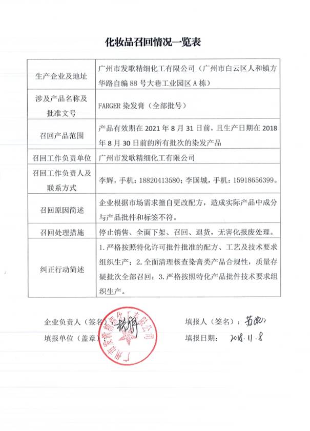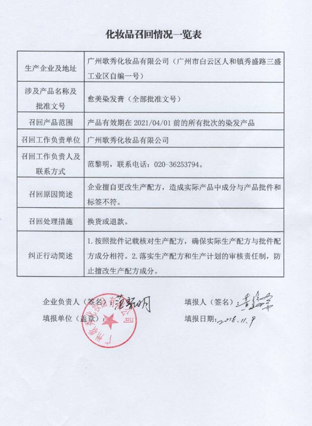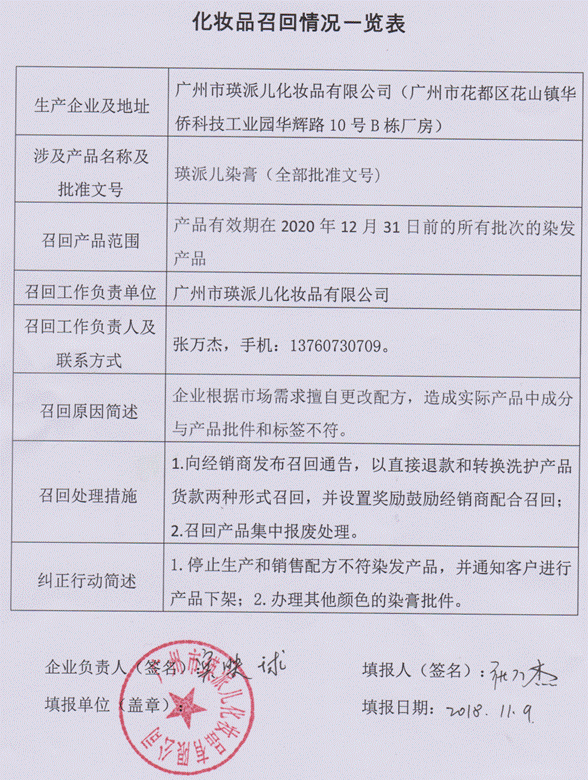 廣州市瑛派兒化妝品有限公司、廣州歌秀化妝品有限公司、廣州市發(fā)歌精細(xì)化工有限公司3家化妝品生產(chǎn)企業(yè)因生產(chǎn)不合格化妝品被原國家食品藥品監(jiān)督管理局通報。上述企業(yè)已對不合格產(chǎn)品實施了主動召回,但仍有部分存在安全隱患的產(chǎn)品無法完成召回。經(jīng)企業(yè)排查并報告我局,決定對存在安全隱患的產(chǎn)品實施全面召回。現(xiàn)將有關(guān)產(chǎn)品信息予以通告,具體內(nèi)容詳見附件:《化妝品召回情況一覽表》。