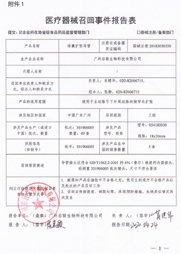 廣州啟駿生物科技有限公司報告,產品抽檢中發現部分球囊擴張導管存在導管接頭尺寸不符合要求的問題。廣州啟駿生物科技有限公司對其生產的該產品(注冊證號:國械注準20183030550)主動召回。召回級別為 三級 。涉及產品的型號、規格及批次等詳細信息見《醫療器械召回事件報告表》。