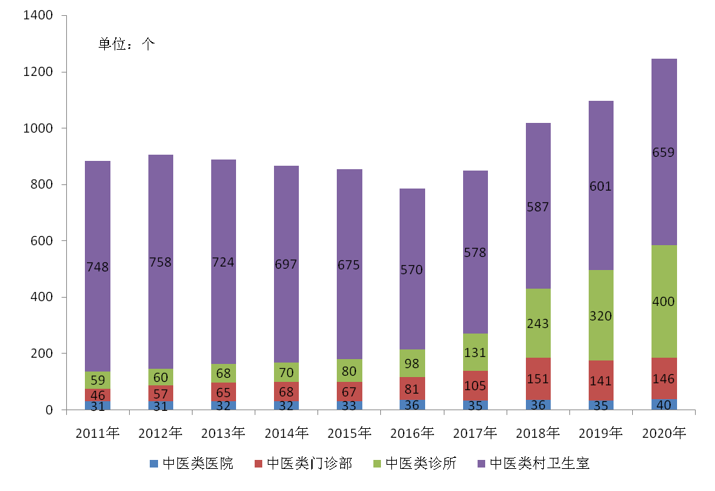 2020年末,全市中醫類醫療機構總數1245個,其中中醫類醫院40個,中醫類門診部146個,中醫類診所400個,中醫類村衛生室659個。與上年相比,中醫醫療衛生機構增加148個,其中:中醫類醫院增加5個,中醫類門診部增加5個,中醫類診所增加80個,中醫類村衛生室增加58個。