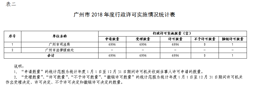 本部門2018年度行政許可申請總數為6996宗,予以許可6996宗。